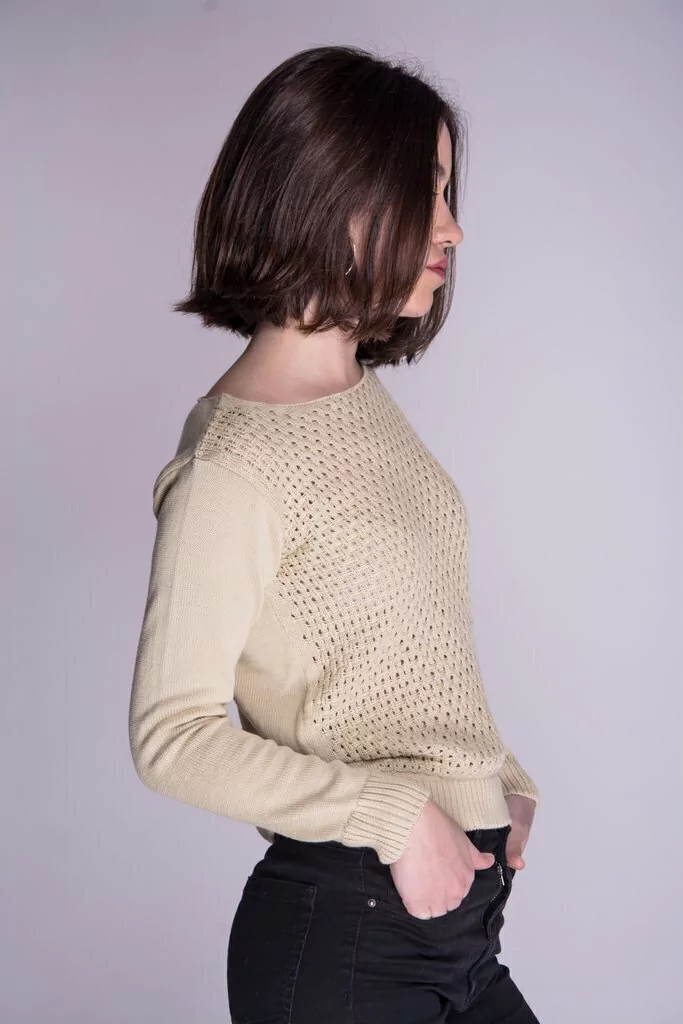 Es un sweater de estructura clásica. De ancho al cuerpo y largo a la cintura. La delantera de la prenda está tejida en un punto calado que dibuja una cuadrícula. Y las espaldas y mangas en Jersey.