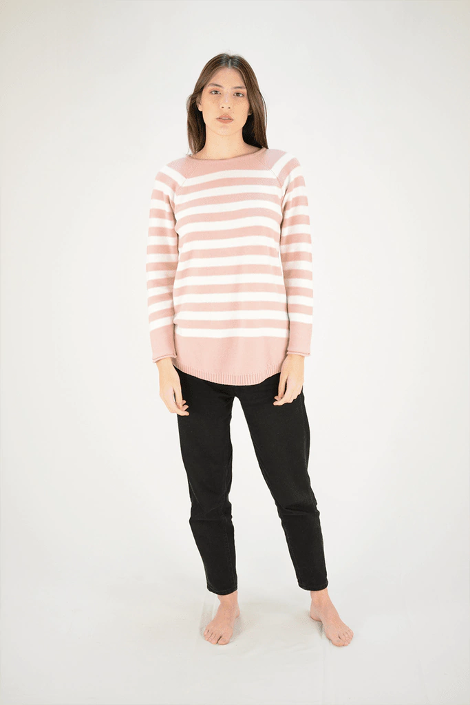 Sweater manga ranglan y cuello redondo rayado. Es de estructura media (no al cuerpo, tampoco oversized). Largo por debajo de la cola. Tiene detalles de pequeños tajos a los laterales y bajos redondeados. Terminación de mangan con un pequeño rulo.