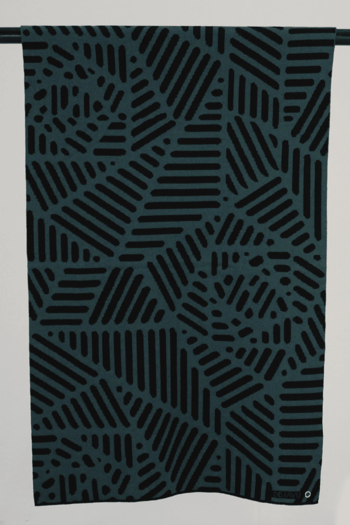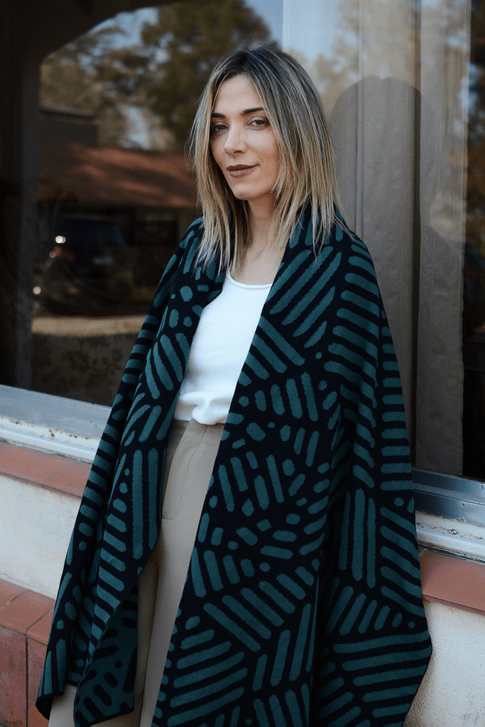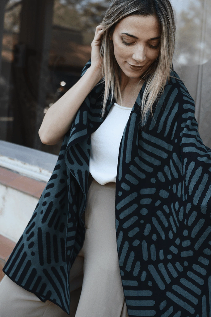 La manta está tejida en forma tubular, de modo que se ve el dibujo del derecho y del revés. Teniendo más fuerza el color oscuro en una cara, y el claro en la otra. Tiene dibujos de barrotes de diversas medidas, que van formando rosetas de forma geométrica. Fue pensada tanto para completar un look, como para decorar y vestir un lindo rincón del hogar o la oficina.
