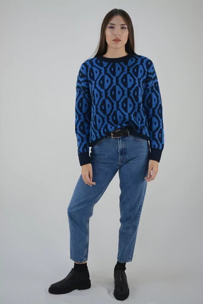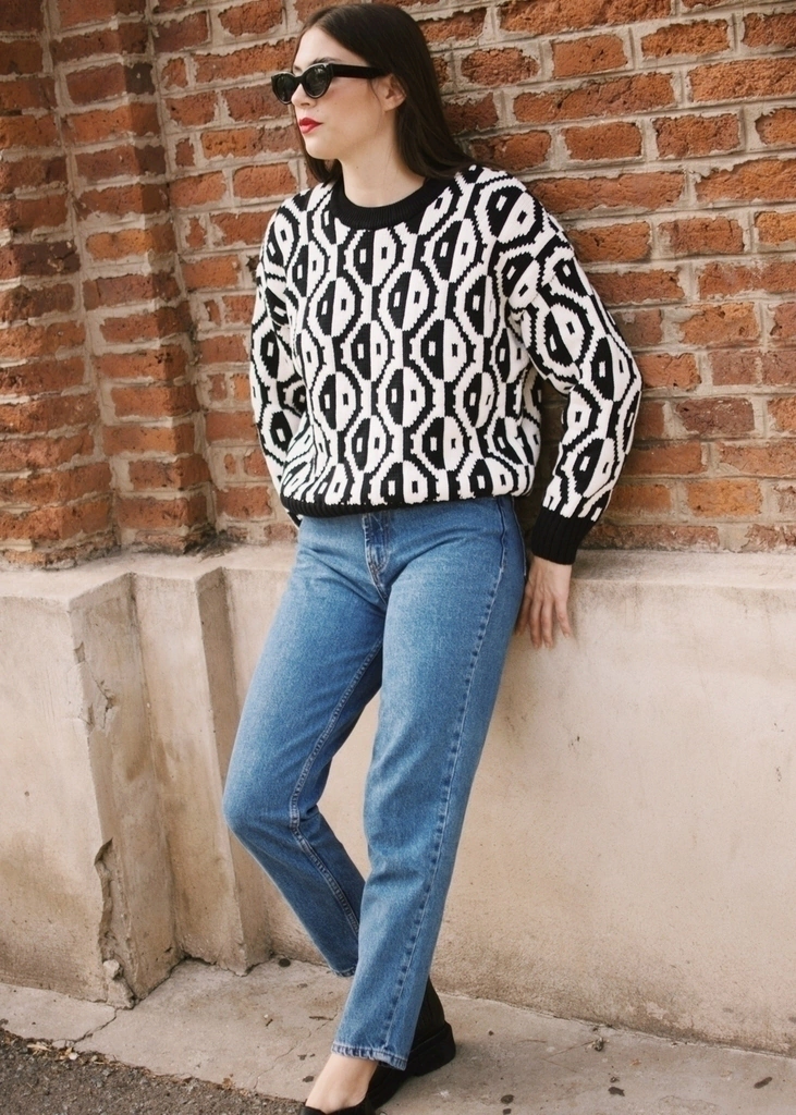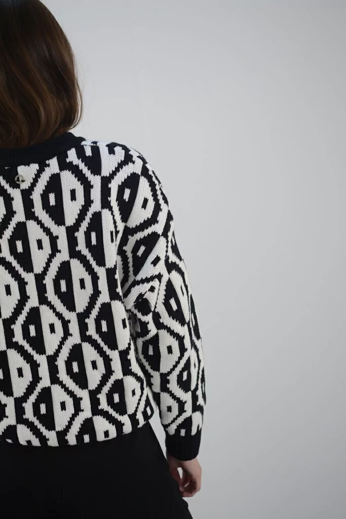 Sweater OVERSIZED grueso y pesado. Largo aproximado a la cintura. Tejido con la técnica de Jaquard, que nos permite hacer dibujos. En este caso, a 2 colores. Es un modelo que marca la tendencia de esta temporada, por su estructura, la técnica de tejido, y la estética de la prenda en sí.