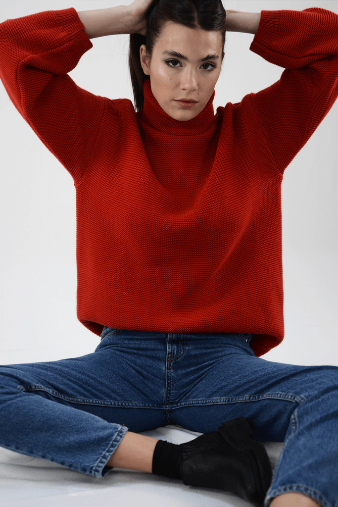 Polerón oversized tejido en punto santa clara, con cuello polera integrado (es decir, que sigue el tejido de la delantera y la espalda, sin costuras). El cuello de la polera es amplio. Al estar tejido en algodón 100%, en una trama gruesa, la prenda es cálida, pero no sofocante. Por lo que es ideal para fríos no tan intensos, o personas que aman las poleras pero no son muy friolentas.