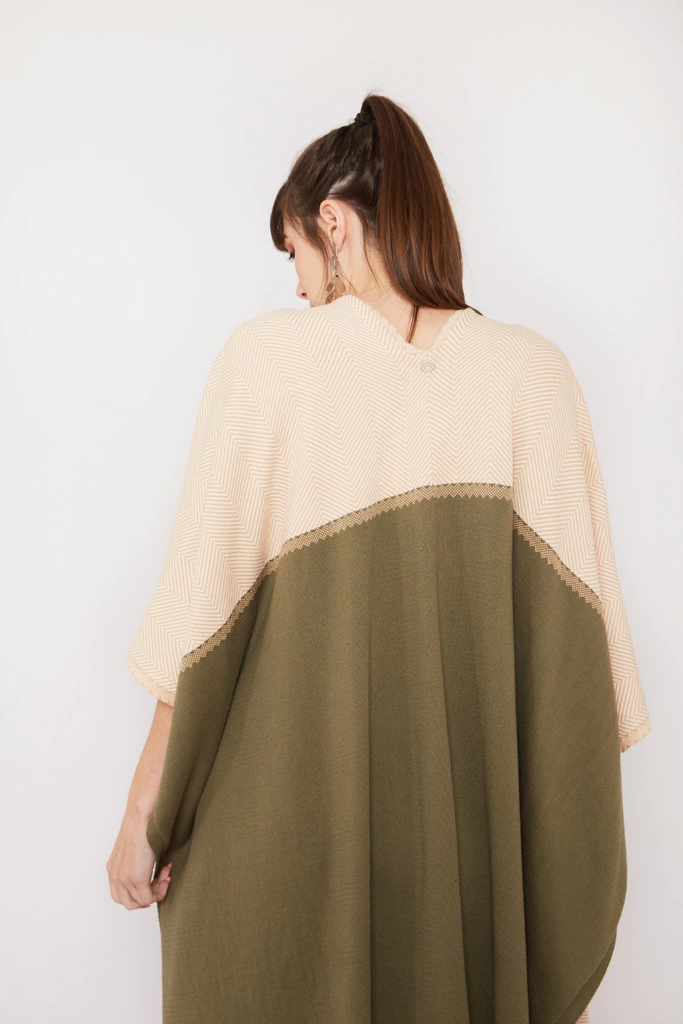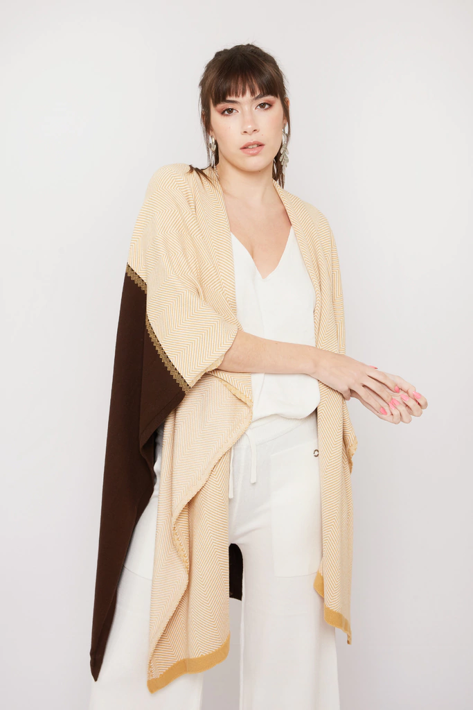 Es LA ruana de la temporada. Combina una trama en zig-zag tejida a dos colores (con la técnica de jaquard) con un tercer color que comienza a mitad de la espalda. La sinergia lograda con las distintas texturas, tramas y colores da como resultado una prenda muy distinguida y diferente a todas las ruanas que hemos hecho hasta acá. Es amplia, práctica, versátil y apta para todo tipo de siluetas.