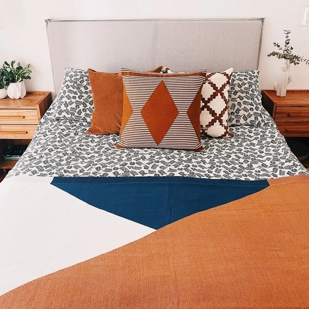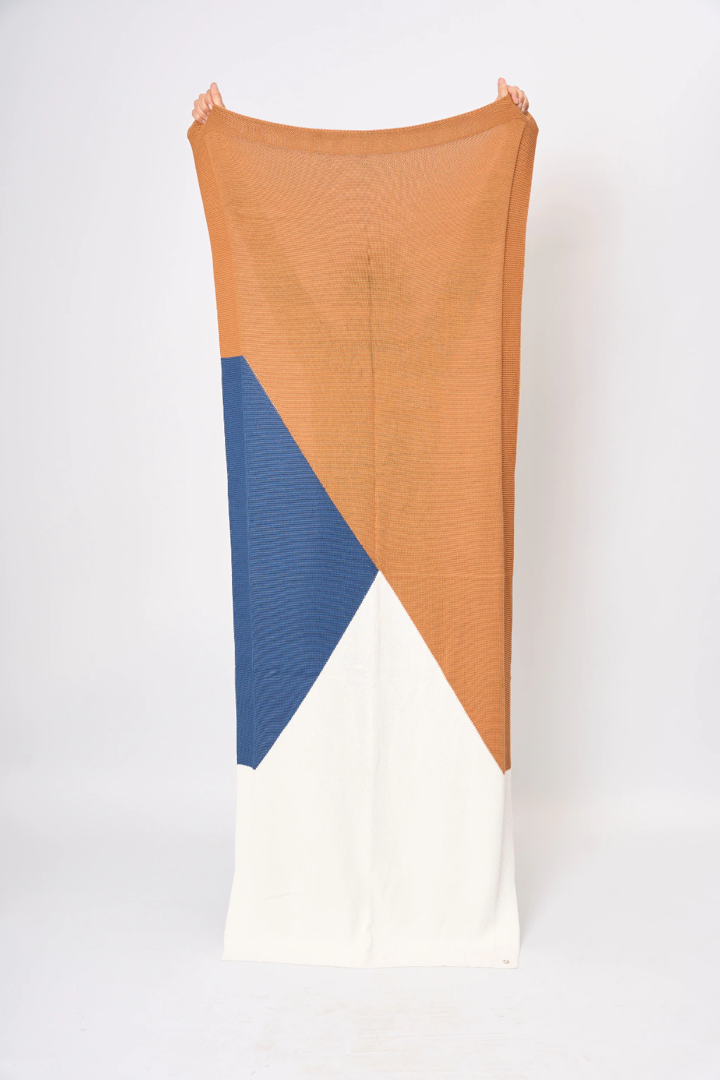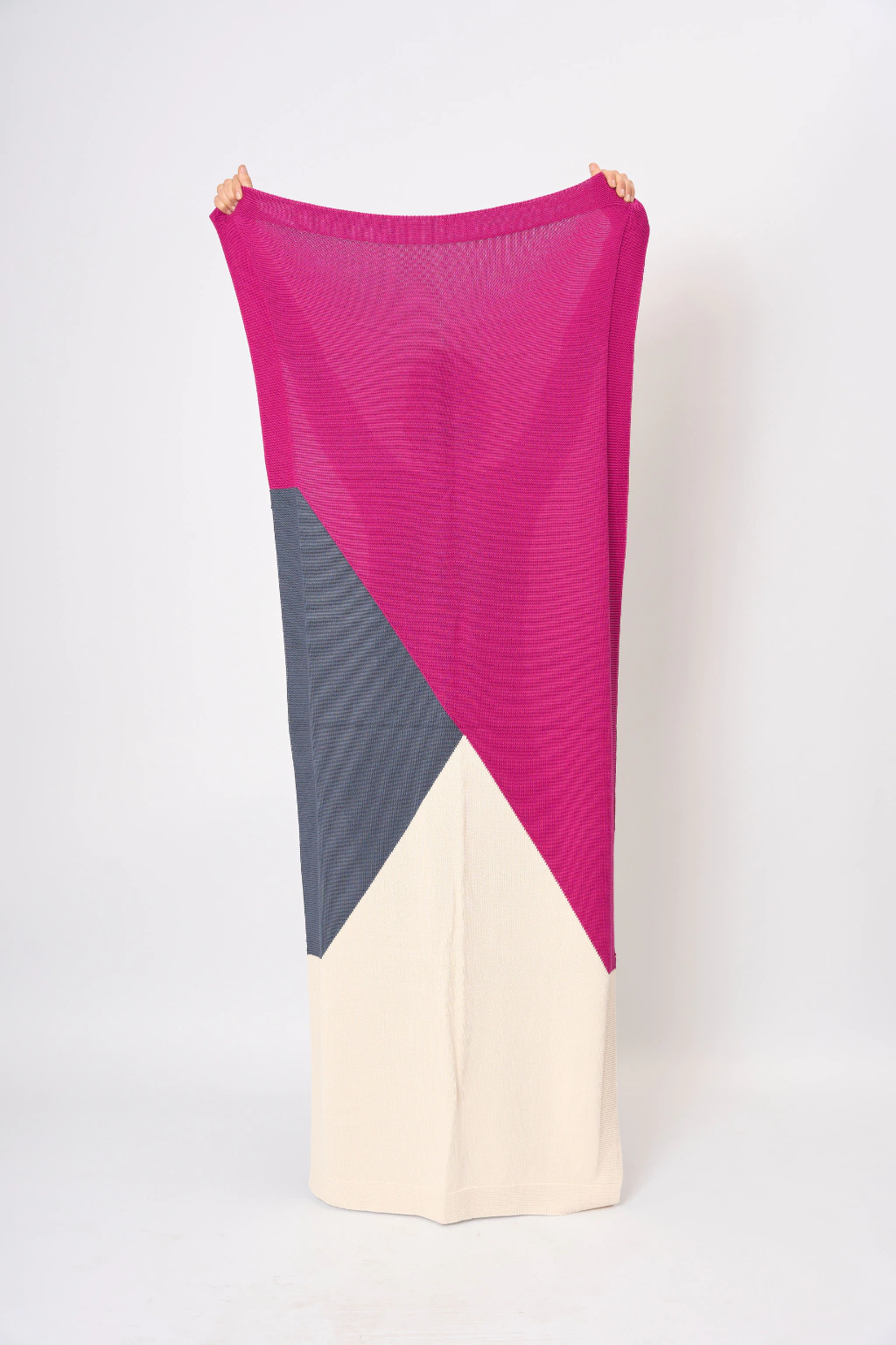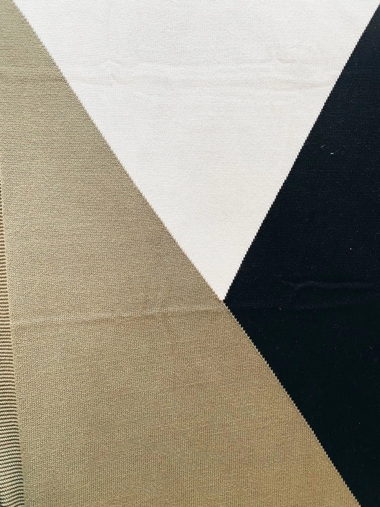 Es una manta distinta a todas las que hemos hecho hasta ahora. Y, una vez más me encuentro con un equipo que me sorprende. Cuando se ama lo que se hace… suceden cosas maravillosas, como esta manta. Vuelvo a la descripción: son simples triángulos combinados con una téncica de tejido llamada Intarsia. Que dibuja mientras teje, sin que los hilos de los ditintos colores se crucen por detrás, como sucede en el jaquard. Esto le da más pureza a los clores y más flexibilidad al tejido. Simplemente perfecta.