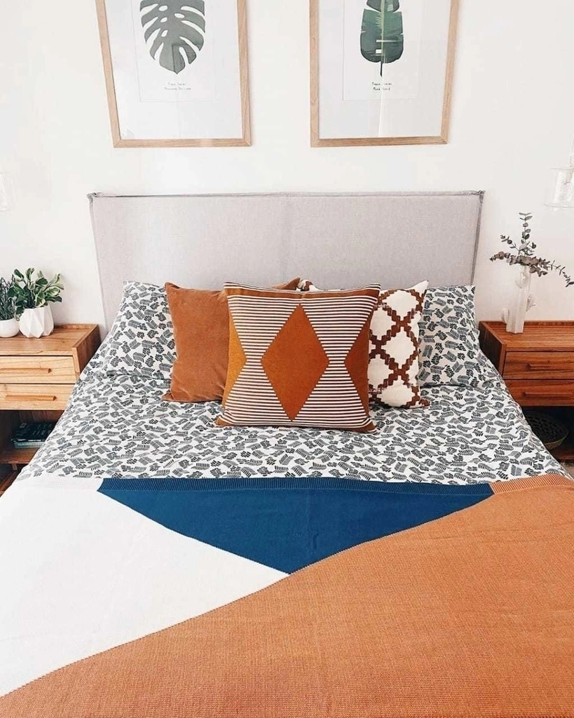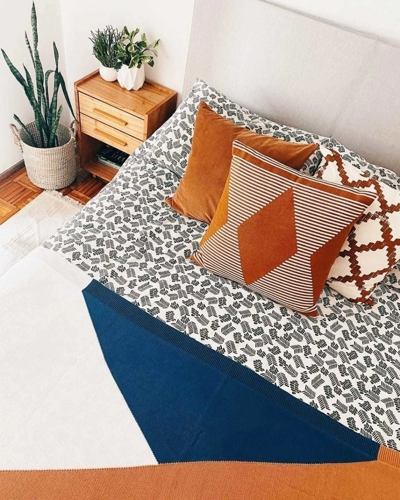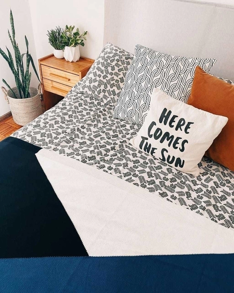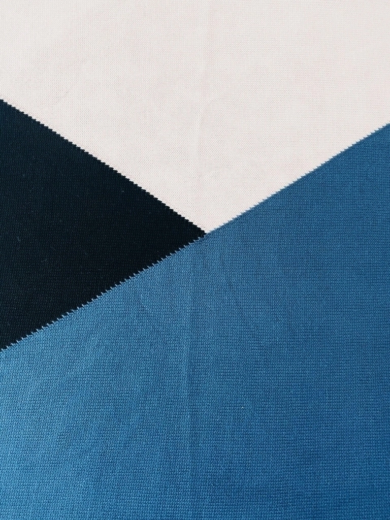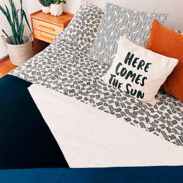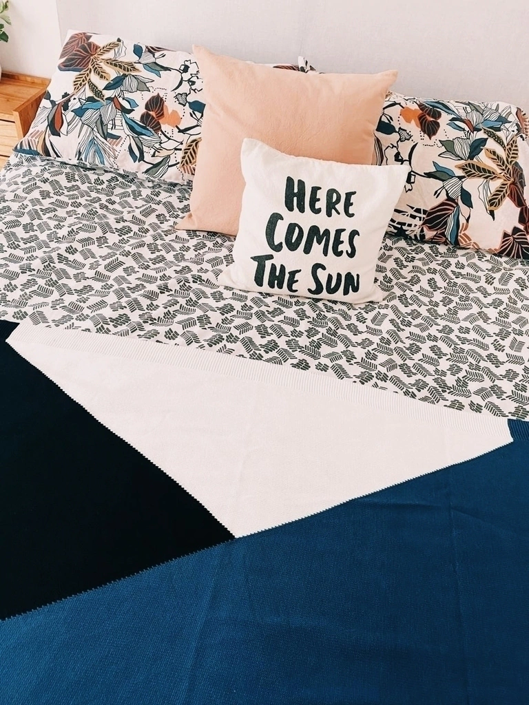 Es una manta distinta a todas las que hemos hecho hasta ahora. Y, una vez más me encuentro con un equipo que me sorprende. Cuando se ama lo que se hace… suceden cosas maravillosas, como esta manta. Vuelvo a la descripción: son simples triángulos combinados con una téncica de tejido llamada Intarsia. Que dibuja mientras teje, sin que los hilos de los ditintos colores se crucen por detrás, como sucede en el jaquard. Esto le da más pureza a los clores y más flexibilidad al tejido. Simplemente perfecta.