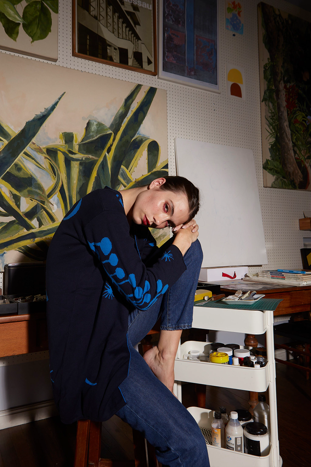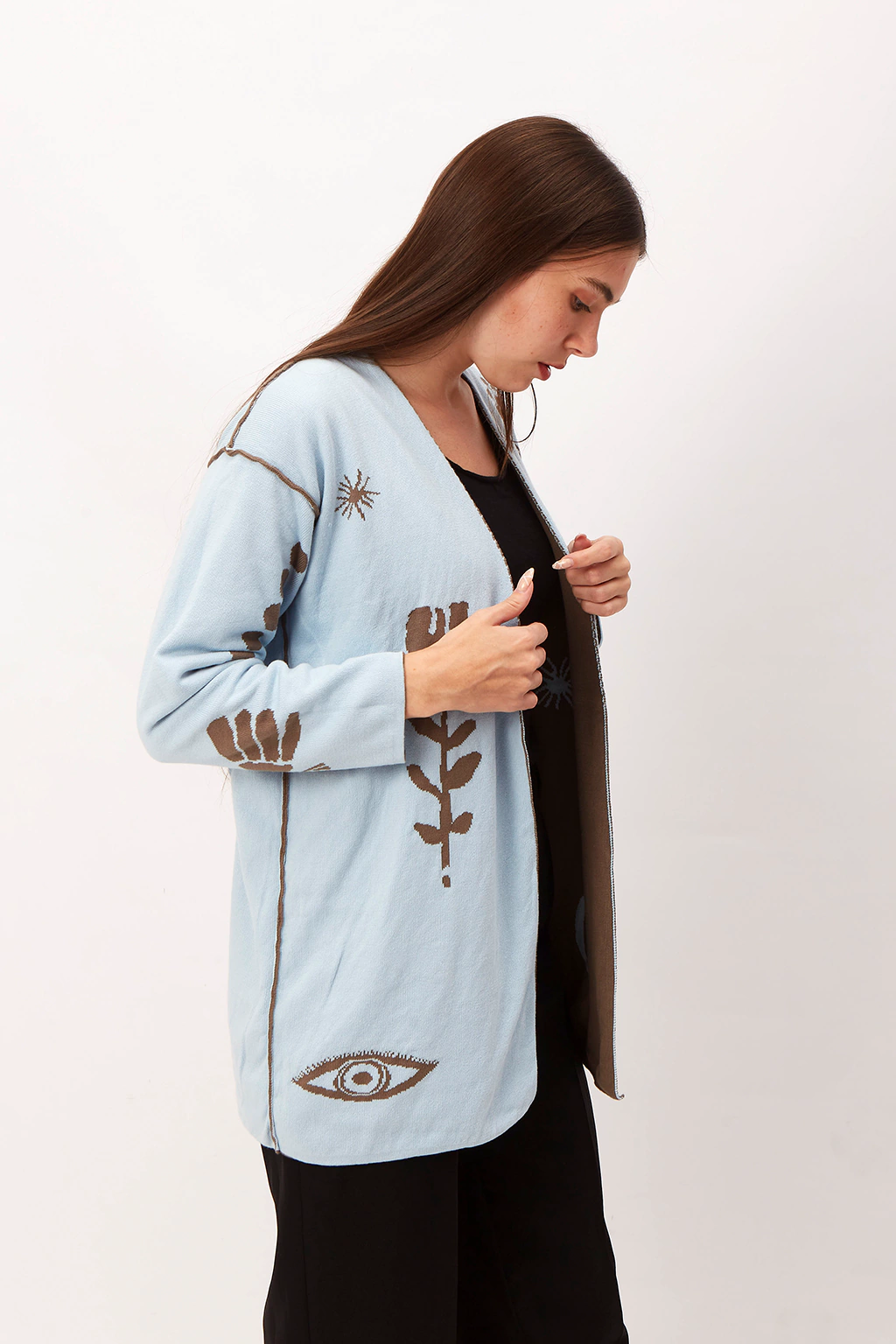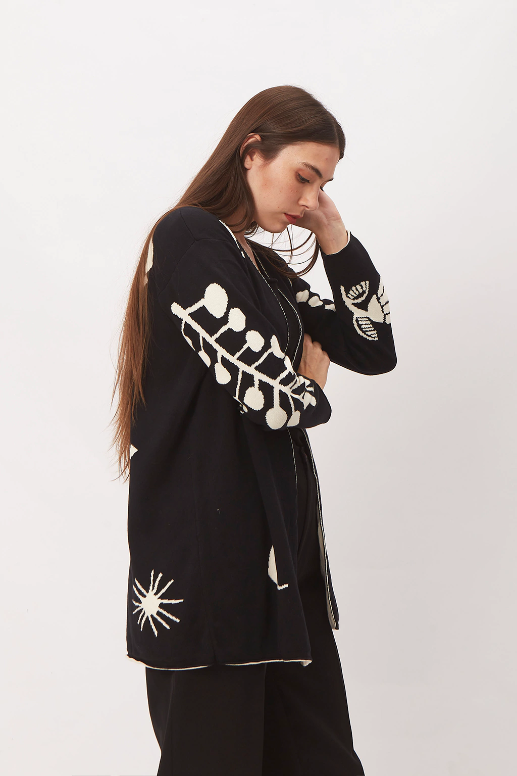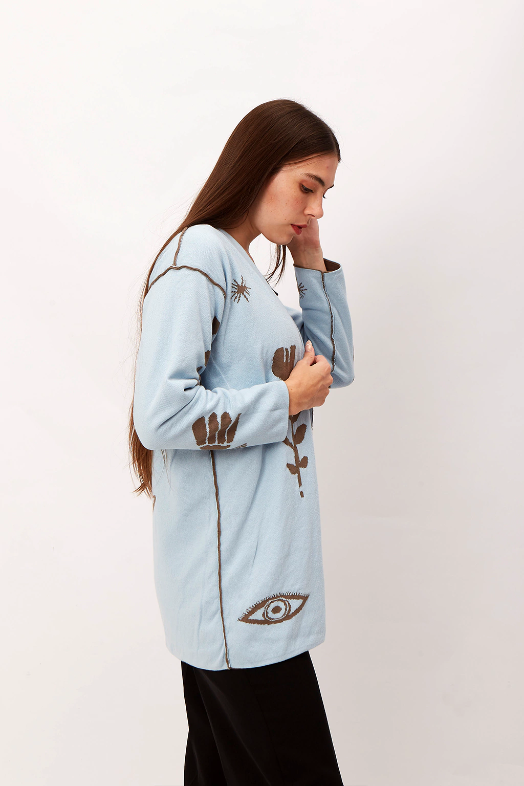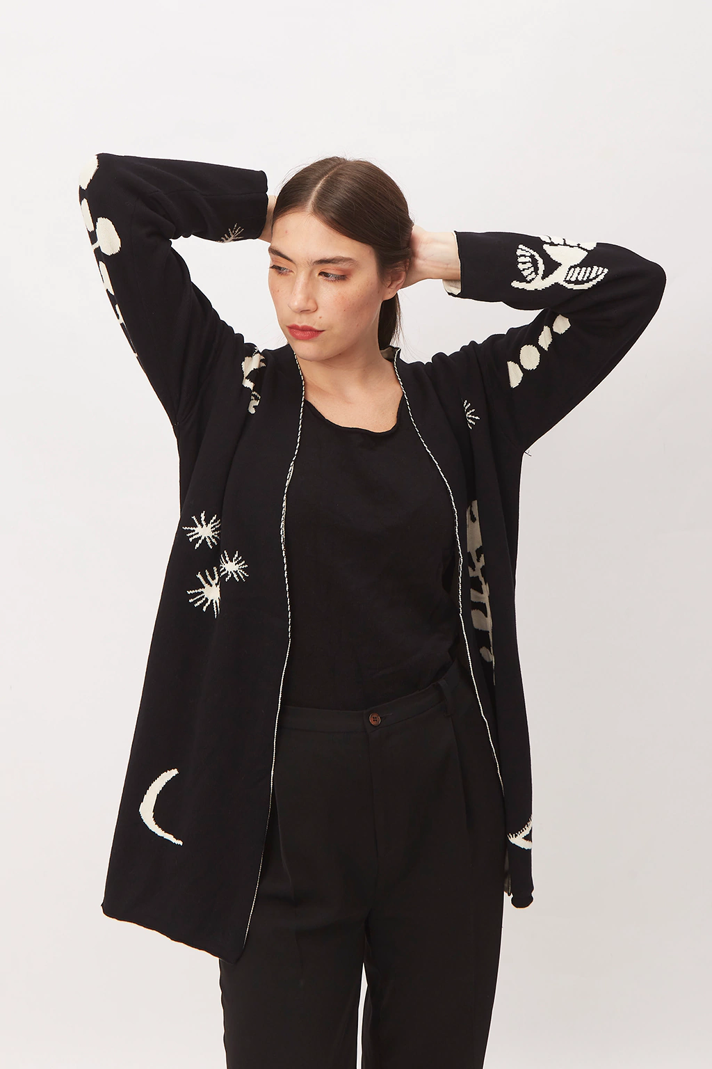 Esta prenda es maravillosa tanto en sus características técnicas como es su diseño. Está integramente teida en forma tubular. Los dibujos (hecos por la genia de Lucila Manchado) se ven de afuera y de adentro. Esto hace que sea totalmente reversible Para mí es una pieza de arte. De estructura simple, hombros caídos y largo debajo de la cola. Más que decir… vale la pena verlo, apreciarlo.