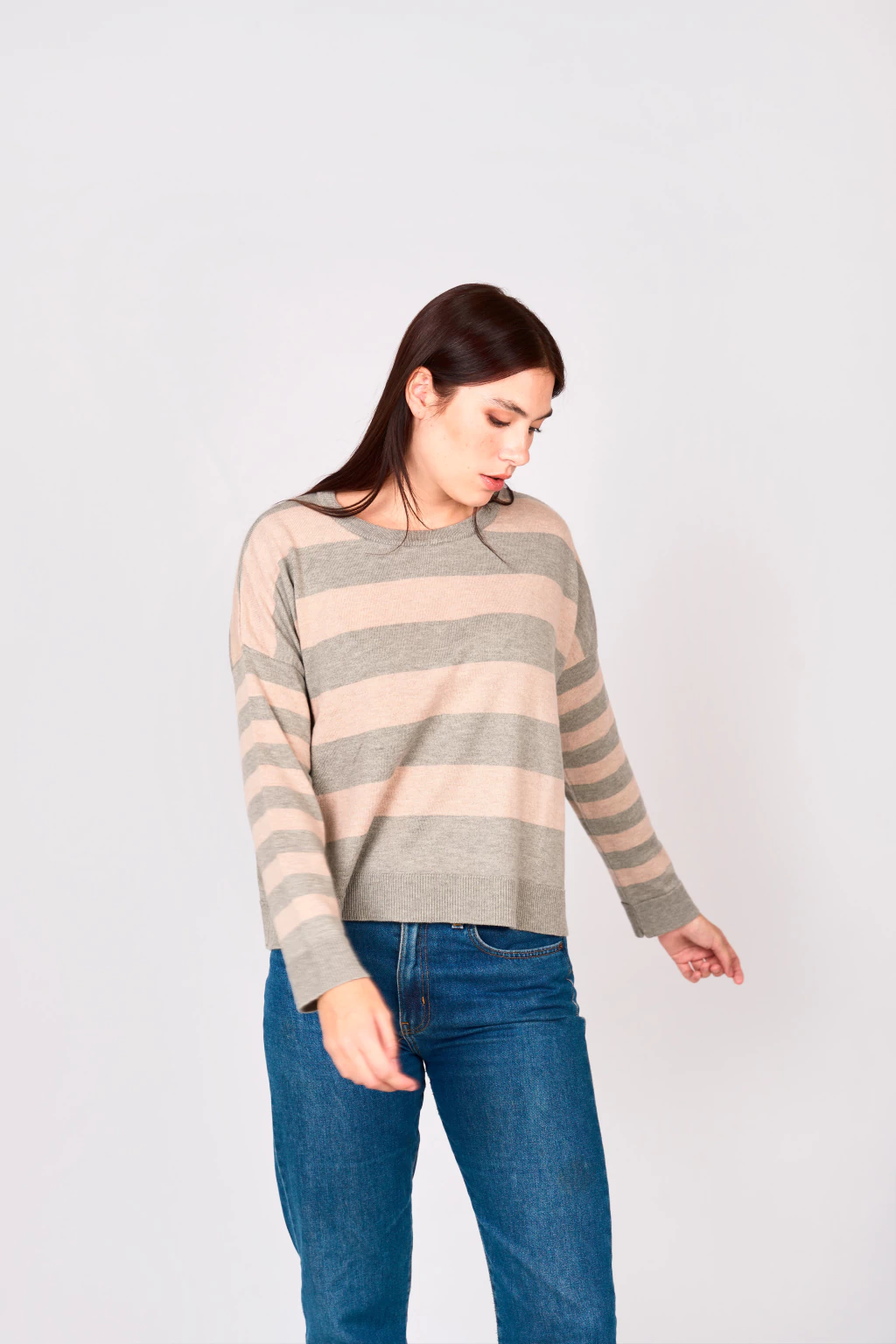 El SWEATER PAULA es una prenda de estructura moderna que combina estilo y comodidad. Su diseño ancho y corto, con hombros caídos y rayas en cuerpo y mangas, lo hace perfecto para cualquier ocasión.